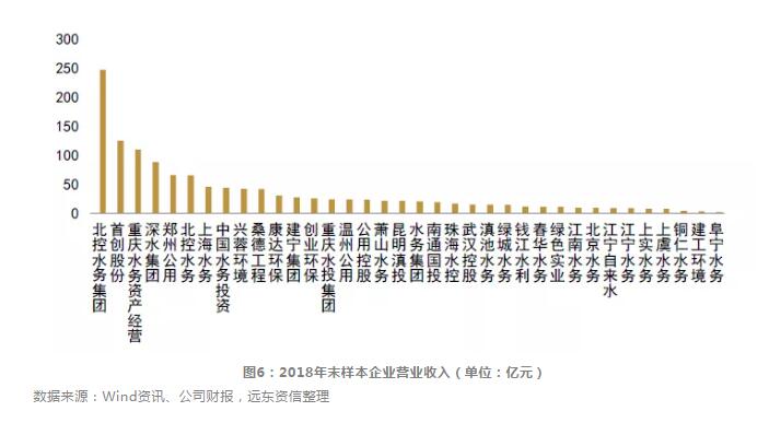 受益于持續(xù)的政策推動,近年來國內(nèi)水務(wù)基礎(chǔ)設(shè)施不斷完善,全國污水處理量等持續(xù)增長,此外水環(huán)境綜合治理等領(lǐng)域的拓展也開拓了水務(wù)企業(yè)的市場空間,行業(yè)整體營業(yè)收入保持增長。水務(wù)企業(yè)收入主要來自供水和污水處理的運營服務(wù),有部分企業(yè)產(chǎn)業(yè)鏈縱向延伸至管道安裝等工程建造服務(wù)和設(shè)備制造銷售、技術(shù)服務(wù)等,總體盈利模式相對穩(wěn)定。2018年,樣本企業(yè)實現(xiàn)營業(yè)收入總額1239.36億元,同比增長16.21%(圖5)。其中,北控水務(wù)集團、重慶水務(wù)、首創(chuàng)股份為行業(yè)前三名,2018年上半年的營業(yè)收入超過均100億元;深圳水務(wù)、鄭州公用、北控水投、桑德工程、中國水投、興蓉環(huán)境、上海水務(wù)、康達環(huán)保、建寧集團、昆明滇投、創(chuàng)業(yè)環(huán)保、重慶水投2018年上半年營業(yè)收入排名前列(圖6)。
