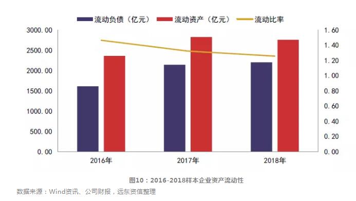 從樣本企業(yè)的負債結(jié)構(gòu)來看,截至2018年底流動負債合計為2196.45億元,占總負債比重為36.81%;非流動資產(chǎn)為3005.62億元,占總資產(chǎn)比重為58.95%(圖10)。流動比率為1.25,較2017年末下降0.07。債務(wù)期限結(jié)構(gòu)略有改善,負債結(jié)構(gòu)總體仍偏長期,面臨的再融資和短期償付壓力相對較小。