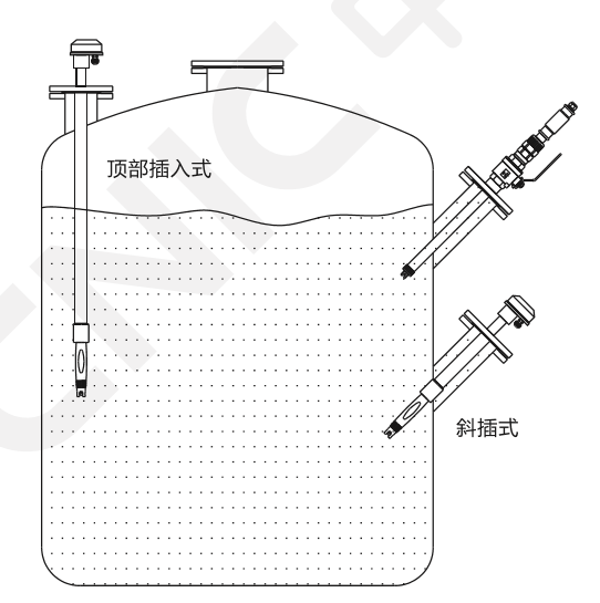 儀表和現(xiàn)場的結(jié)合形式,比如:從反應(yīng)釜(罐子)底部插入;從反應(yīng)釜(罐子)側(cè)壁插入;水池(槽)頂部插入;管道插入;管道截斷(管段式);