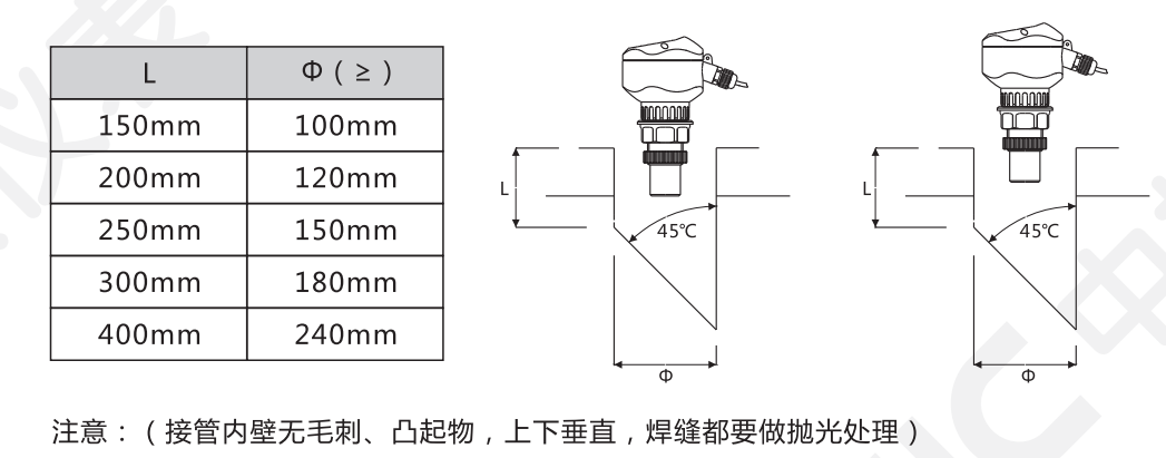 6、導(dǎo)波管:深井等聲束角內(nèi)有障礙物、或者液面波動大的場合,可以將傳感器安裝到導(dǎo)波管內(nèi)或者旁通管內(nèi);