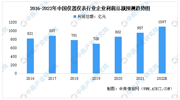 其增長速度整體而言高于主營收入的增長速度,說明我國儀器儀表行業(yè)的盈利能力不斷提升,已步入高質(zhì)量發(fā)展階段。中商產(chǎn)業(yè)研究院預(yù)測,2022年我國儀器儀表行業(yè)企業(yè)利潤總額將達1097億元。