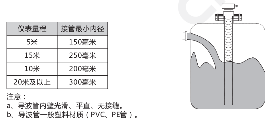 6、導(dǎo)波管:深井等聲束角內(nèi)有障礙物、或者液面波動大的場合,可以將傳感器安裝到導(dǎo)波管內(nèi)或者旁通管內(nèi);