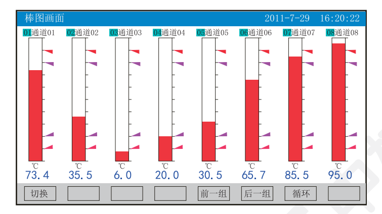 5、棒圖畫面:以棒圖的形式顯示測量值,同時還可顯示通道位號、工程單位及報警狀態(tài)等信息。