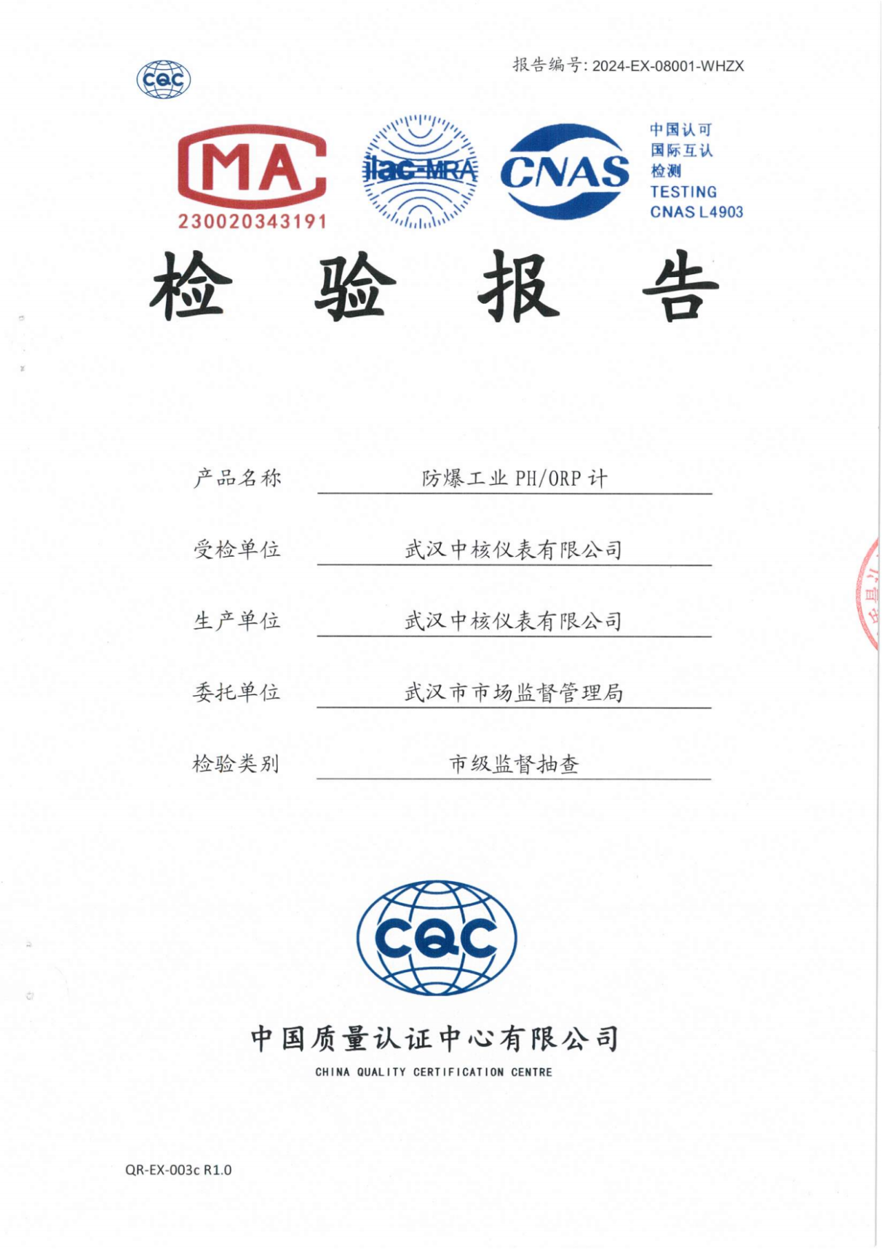 按照國(guó)家市場(chǎng)監(jiān)督管理總局要求,本次抽檢采取“隨機(jī)抽樣”形式,重點(diǎn)抽取本地區(qū)產(chǎn)業(yè)聚集、消費(fèi)使用量大的產(chǎn)品,以切實(shí)反映武漢地區(qū)工業(yè)產(chǎn)品總體質(zhì)量狀況。中核儀表防爆工業(yè)pH/ORP計(jì)在本次抽檢之列,并由中國(guó)質(zhì)量認(rèn)證中心承檢。以下為抽檢結(jié)果展示,測(cè)定樣品為合格品。