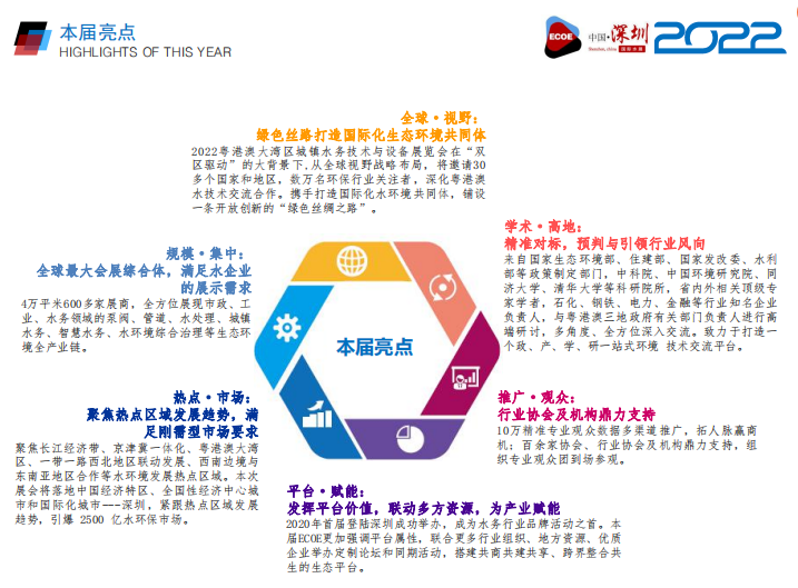 在“雙區(qū)驅(qū)動”的大背景下,“2022粵港澳大灣區(qū)水處理技術(shù)設(shè)備展覽會”將于2023年3月16-18日在深圳國際會展中心(寶安區(qū))召開。展會將以“專業(yè)研討+展覽展示”的方式,深度打造吸引創(chuàng)新力量、聚合科研團隊、培育創(chuàng)新活力的專業(yè)平臺,為以深圳為中心的粵港澳大灣區(qū)在生態(tài)環(huán)境領(lǐng)域的創(chuàng)新治理提供支撐和服務(wù)。